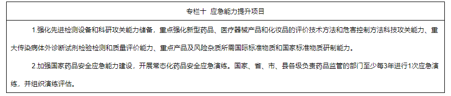 2.健全應急管理制度機制。完善藥品安全事件應急預案,健全應急審評審批、檢驗檢測、監(jiān)督檢查機制,完善藥品儲備和供應制度。加強藥品檢驗評價通用技術和關鍵技術研究,提升緊急情況下快速建立對新型藥品、醫(yī)療器械產品,特別是重大傳染病體外診斷試劑、疫苗、抗體藥物等檢驗評價技術能力。
