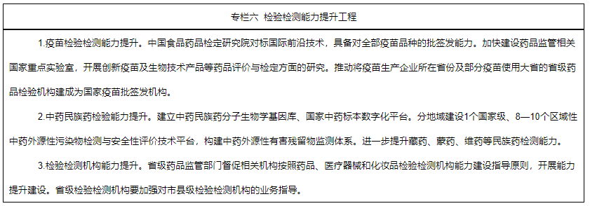 5.加強檢驗檢測體系建設。加強藥品、醫(yī)療器械檢驗檢測關鍵技術和平臺建設。以中國食品藥品檢定研究院為龍頭、國家藥監(jiān)局重點實驗室為骨干、省級檢驗檢測機構為依托,完善科學權威的藥品、醫(yī)療器械和化妝品檢驗檢測體系。國家級檢驗機構著重瞄準國際技術前沿,強化重點專業(yè)領域檢驗能力建設。地方各級檢驗機構針對日常和應急檢驗需求,補齊能力短板,力爭具備應對突發(fā)公共衛(wèi)生事件“應檢盡檢”能力。圍繞藥品關聯(lián)審評審批及監(jiān)管需要,推動建立布局合理、重點突出的藥用輔料和藥包材檢驗檢測體系。