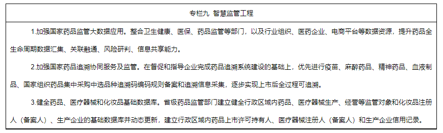 1.建立健全藥品信息化追溯體系。落實藥品上市許可持有人追溯主體責任。完善藥品信息化追溯體系,構建國家藥品追溯協(xié)同服務和監(jiān)管體系,推進藥品追溯信息互通共享,實現(xiàn)重點類別藥品全過程來源可溯、去向可追。逐步實施醫(yī)療器械唯一標識,完善醫(yī)療器械唯一標識數(shù)據(jù)庫,加強在上市后監(jiān)管、醫(yī)療管理、醫(yī)保管理等領域的銜接應用。