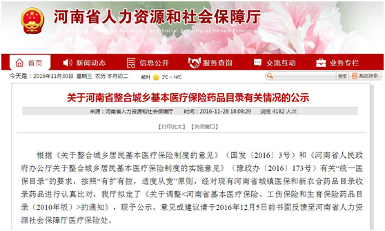 根據(jù)《關(guān)于整合城鄉(xiāng)居民基本醫(yī)療保險制度的意見》(國發(fā)〔2016〕3號)和《河南省人民政府辦公廳關(guān)于整合城鄉(xiāng)居民基本醫(yī)療保險制度的實施意見》(豫政辦〔2016〕173號)有關(guān)“統(tǒng)一醫(yī)保目錄”的要求,河南省人力資源和社會保障廳對《河南省基本醫(yī)療保險、工傷保險和生育保險藥品目錄(2010年版)進行調(diào)整。
