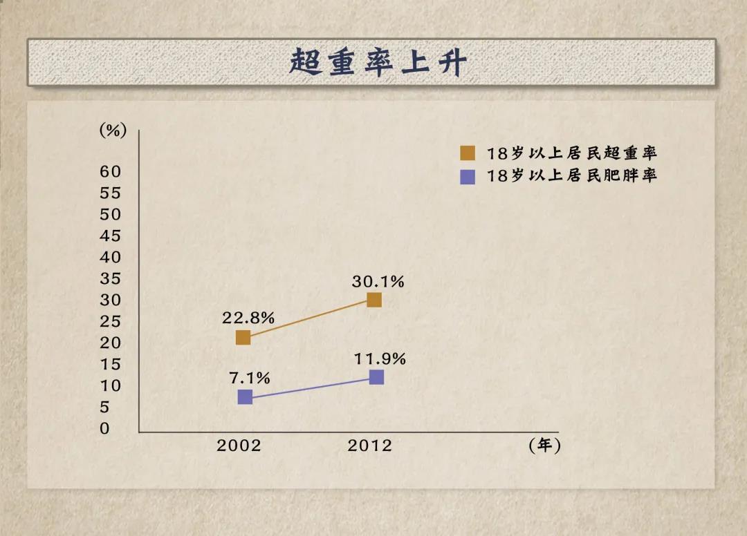 2002年至2012年,18歲以上居民超重率從2002年的22.8%升至30.1%,肥胖率從7.1%升至11.9%。2017年,全國(guó)歸因于高BMI(體重指數(shù))的心血管病死亡人數(shù)為59萬(wàn),占心血管病死亡總數(shù)的13.5%。