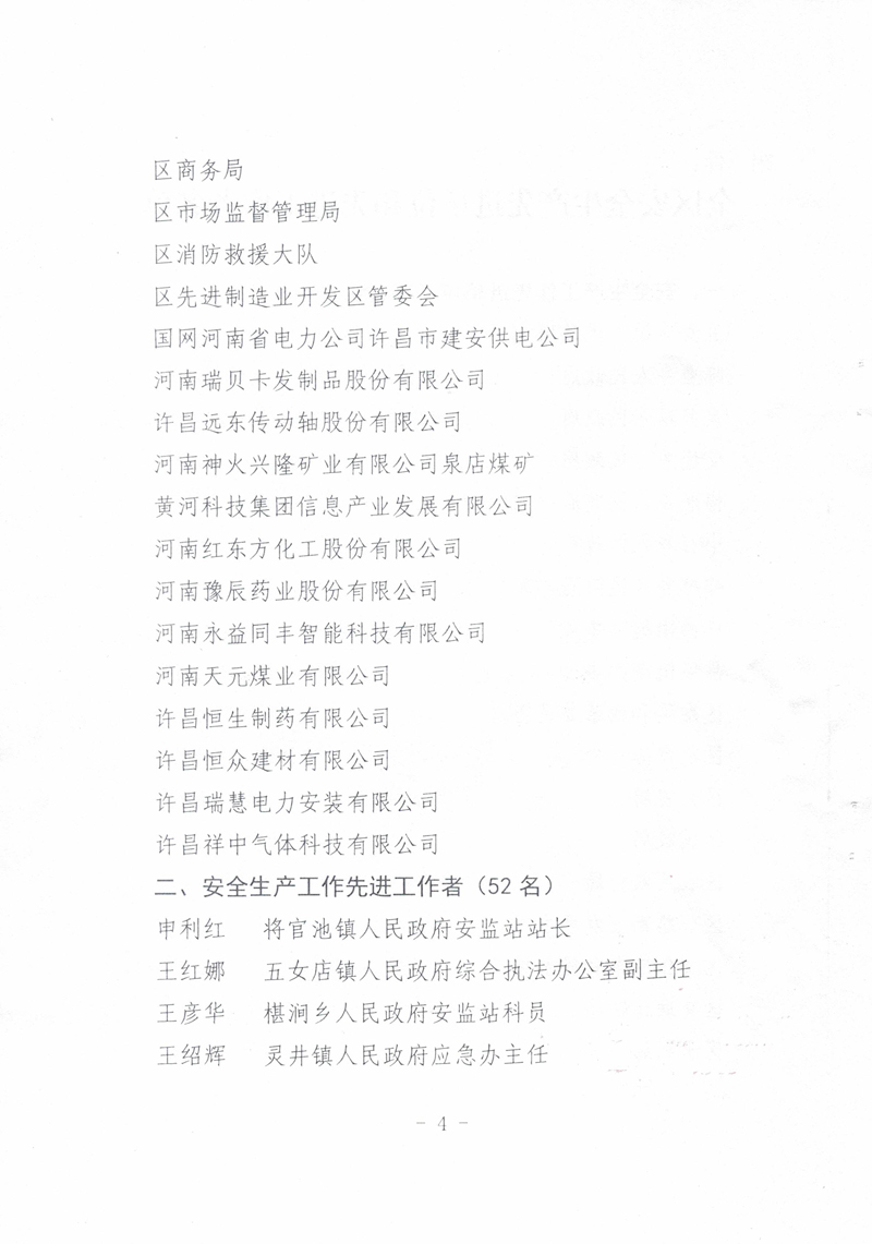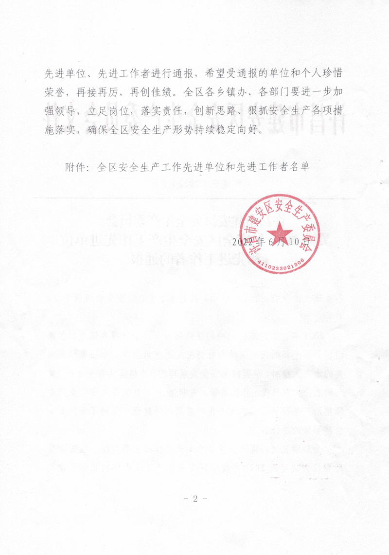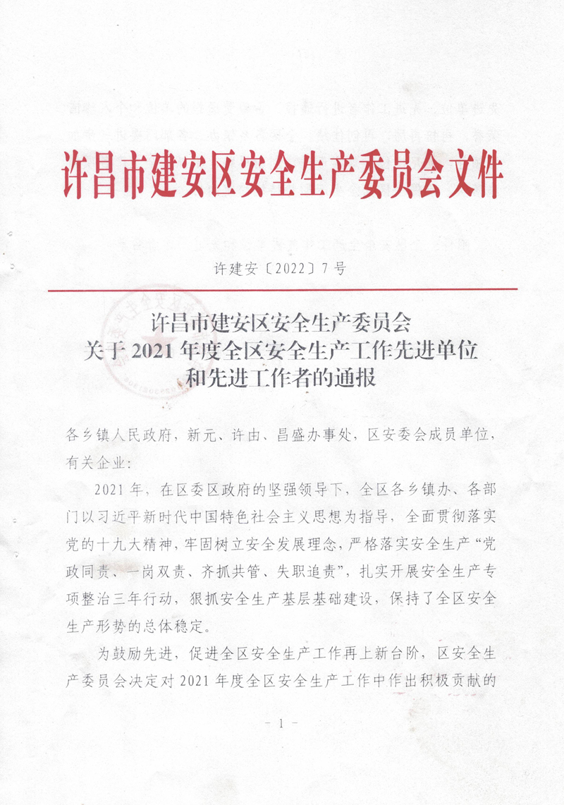 2021年,我公司以習近平新時代中國特色社會主義思想為指導,全面貫徹落實黨的十九大精神,牢固樹立安全發(fā)展理念,嚴格落實安全生產(chǎn)“黨政同責、一崗雙責、齊抓共管、失職追責”,狠抓安全生產(chǎn)基層基礎建設,排除潛在的安全隱患,保持了廠區(qū)安全生產(chǎn)形勢的總體穩(wěn)定。故許昌市建安區(qū)安全生產(chǎn)委員會對我公司在2021年度安全生產(chǎn)工作中的積極貢獻進行了表彰,授予于“全區(qū)安全生產(chǎn)工作先進單位”稱號。